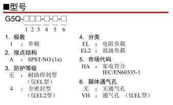 產(chǎn)品說明:G5Q-EL 印刷基板用功率繼電器 高性能小型功率繼電器 ? [G5Q-EL] 與G5Q標(biāo)準(zhǔn)型相比, 擁有更高性能。 10A (AC250V) 下的開關(guān)壽命為100,000次操作以上。 ? [G5Q-EL2] 高沖擊容量性能(沖擊電流40A)。 符合UL508 TV3。 ? 符合IEC/EN 60335-1。 ? 線圈絕緣: F級(UL1446)