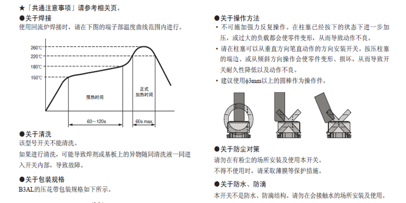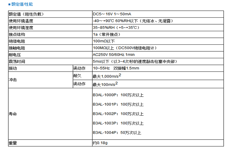產(chǎn)品說明:B3AL 長行程 輕觸式開關 高負載與高壽命兼?zhèn)涞拈L行程輕觸開關 ? 高負載型也實現(xiàn)了高壽命。(參考值:OF=5N、壽命50萬次) ? 開關內(nèi)部采用橡膠柱塞,實現(xiàn)了長行程。/span>
