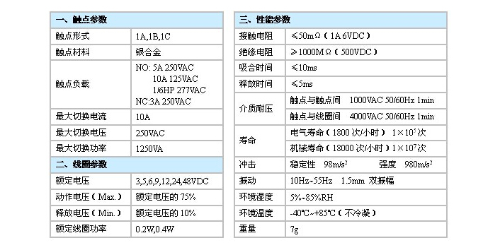 觸點(diǎn)容量:NO:5A 250VAC,10A 125VAC,1/6HP 277VAC NC:3A 250VAC