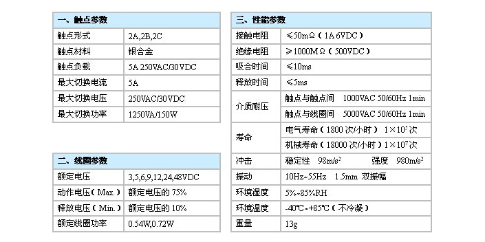 產(chǎn)品說明:產(chǎn)品尺寸(mm):29.2×12.8×20.4 觸點(diǎn)容量:5A 250VAC/30VDC 線圈功率(W):0.54W,0.72W 介質(zhì)耐壓(VAC):5000VAC
