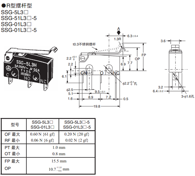 | R型擺桿型 | 焊接端子 | 0.60 N {61 gf} | SSG-5L3H | SSG-01L3H |