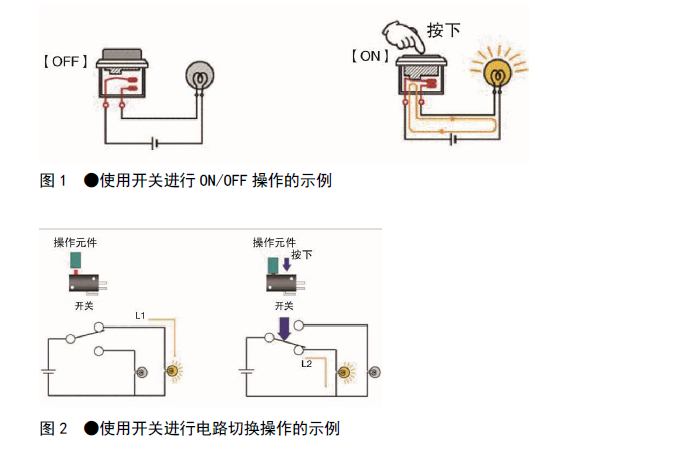 例如圖1中所示,在電源和電燈之間連接一個開關,當受到按壓開關的外力作用時,就會進行使電燈點亮的“ON”操作或使電燈熄滅的“OFF”操作。圖2是電路切換的應用例。在開關未按下時,L1電路的燈亮起,按下開關后,電路發(fā)生切換,L2電路的燈亮起。
