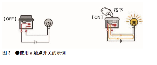 a觸點是指不操作開關時兩個觸點端子呈分離狀態(tài)(OFF),操作開關后則閉合(ON)的觸點。希望通過操作開關來啟動負載的情況下可以使用a觸點。上面圖1中介紹的電路就是使用a觸點的電路,未操作開關(按下)時燈不亮,操作開關后燈點亮(圖3)。