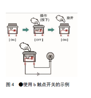 b觸點的接觸規(guī)格與a觸點相反。即,不操作開關時兩個觸點端子呈閉合狀態(tài)(ON),操作開關后則分離(OFF)。在圖4所示的電路中,操作開關(按下)時燈熄滅,不操作時燈亮起。希望通過操作開關停止負載運行時可以使用b觸點。