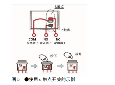 c觸點是a觸點和b觸點組合成一個開關形成的。c觸點的端子有公共端子(COM:公共)、常閉端子(NC:常閉)、常開端子(NO:常開)(圖5)。未操作開關(按下)時,公共端子和常閉端子接觸,操作開關(按下)時,公共端子和常開端子接觸。希望通過開關操作進行兩個電路的切換時使用c觸點。
