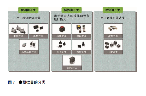 開關的主要目的可分為檢測/操作/設定三類(圖7)。其中,檢測開關有檢測物體位置的限位開關、微動開關、小型檢測開關。這些開關在各種用途中可以發(fā)揮高精度位置檢測功能。