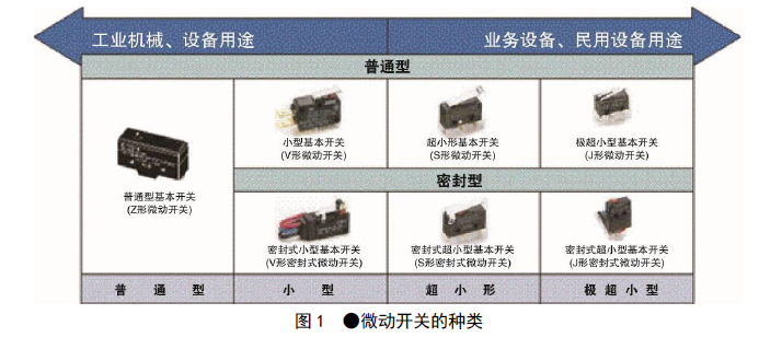 外形尺寸可分為普通型、小型、超小型、極超小型四種。(圖1)普通型用于大型工業(yè)機械及設備,小型、超小型、極超小型則用于業(yè)務設備及家電、小型薄型民用設備。此外,根據耐環(huán)境性,還可分為采取了密封措施的密封型及普通型。