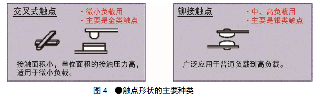 是微動開關的心臟部分,通過觸點進行電路的ON/OFF。根據ON/OFF的電壓及電流,采用不同的觸點材料及形狀。材料主要以金、銀及其合金以及金銀電鍍?yōu)橹鳌P螤钣薪徊媸接|點、鉚接觸點等。(圖4)