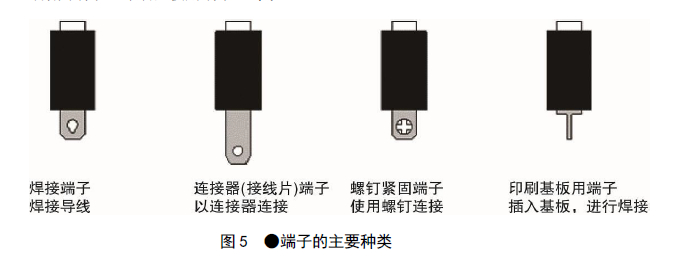 具有連接開關和外部電路的作用,根據連接方法,可以分為焊接端子、接線片端子、螺釘緊固端子、印刷基板用端子。(圖5)