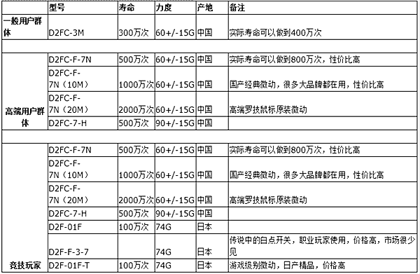 所以說鼠標(biāo)微動開關(guān)作為鼠標(biāo)的核心部件,一直是眾多品牌花大成本去研發(fā)的重點。特別是當(dāng)鼠標(biāo)不再純粹的作為辦公用品,而作為電競比賽工具的今天,鼠標(biāo)的微動開關(guān)已經(jīng)直接決定了鼠標(biāo)手感和按鍵壽命。目前市面上究竟有什么微動是適合電競游戲鼠標(biāo)的呢?