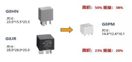 G8PM相比原有的插拔繼電器,重量面積體積大幅縮小,減小模組重量和板載面積,有助于客戶輕量化設(shè)計。