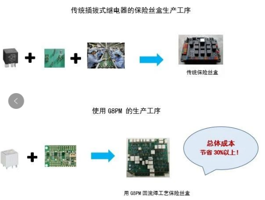 現(xiàn)有汽車保險絲盒大部分使用插拔繼電器,需配合大量銅片端子使用,還得浪費大量人工進(jìn)行插件操作。而歐姆龍G8PM可以使用回流焊工藝一次成型,大大簡化工序和降低成本。
