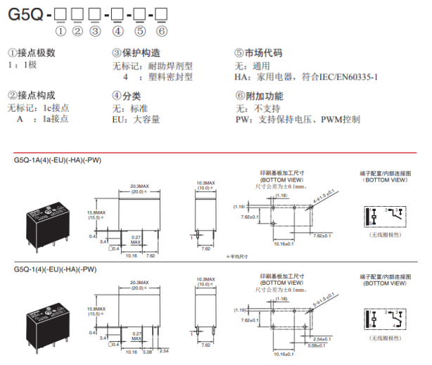 G5Q繼電器在電源的應用上是較為廣泛的一款繼電器,具有高開關性能,適用于各種負載的,可確保8kV耐沖擊電壓(線圈-接點)的一款小型繼電器,下面如圖所示;G5Q的尺寸在安裝和選型也有著較多的選擇: