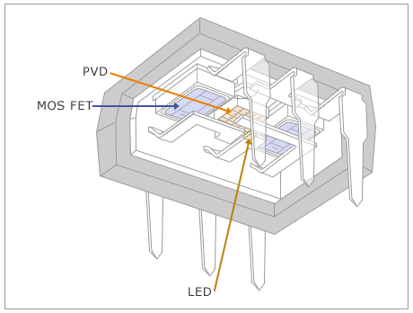 此外,如下圖所示,在我們的光耦合MOSFET中,輸入LED和輸出側(cè)的PVD用具有高透明度的高度絕緣樹脂彼此絕緣,并且外部還被黑色覆蓋。深色的深色樹脂。