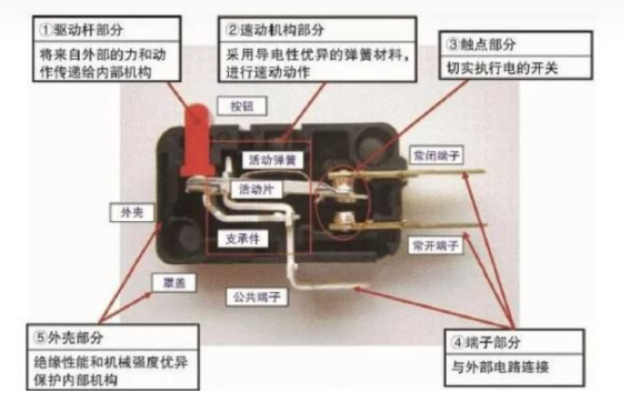 04構(gòu)造 如圖2所示,微動開關(guān)由①驅(qū)動桿部分、②速動機(jī)構(gòu)部分、③觸點(diǎn)部分、④端子部分、⑤外殼部分構(gòu)成。