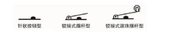 具有將從操作元件等外部受到的力及動作向內(nèi)部機(jī)構(gòu)傳遞的功能,可根據(jù)操作元件的形狀及動作使用不同的驅(qū)動桿。具有代表性的驅(qū)動桿形狀有針狀按鈕型、鉸接式擺桿型、鉸接式滾珠擺桿型(圖3)。