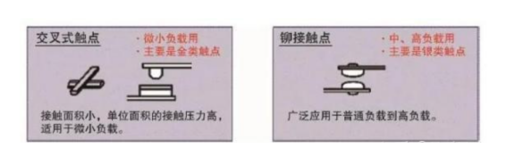 觸點(diǎn)部是微動開關(guān)的心臟部分,通過觸點(diǎn)進(jìn)行電路的ON/OFF。根據(jù)ON/OFF的電壓及電流,采用不同的觸點(diǎn)材料及形狀。材料主要以金、銀及其合金以及金銀電鍍?yōu)橹鳌P螤钣薪徊媸接|點(diǎn)、鉚接觸點(diǎn)等(圖4)。