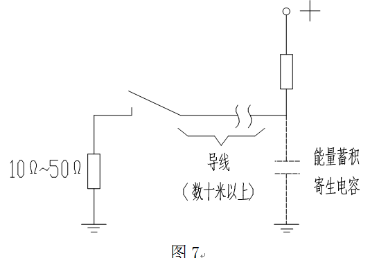 在繼電器觸點電路中,使用數(shù)十米以上的長導線時,由于導線內(nèi)有寄生電容量存在,會產(chǎn)生沖擊電流,請在觸點電路上串聯(lián)電阻(約10Ω~50Ω),如圖7。